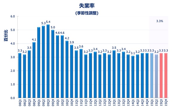 經季節性調整的失業率臨時數字,在2015年8月的三個月維持在3.3%水平。相對於其他發達經濟體,香港的失業率一直維持在較低水平,反映了勞動力市場的緊張情況。預期就業市場在未來數季仍緊張。預計失業率在2015年第三季、第四季及全年均維持在3.3%的水平。比較2015年第三季,第四季就業人數將增加10,000人,2015年第四季勞數人口達四百萬人。