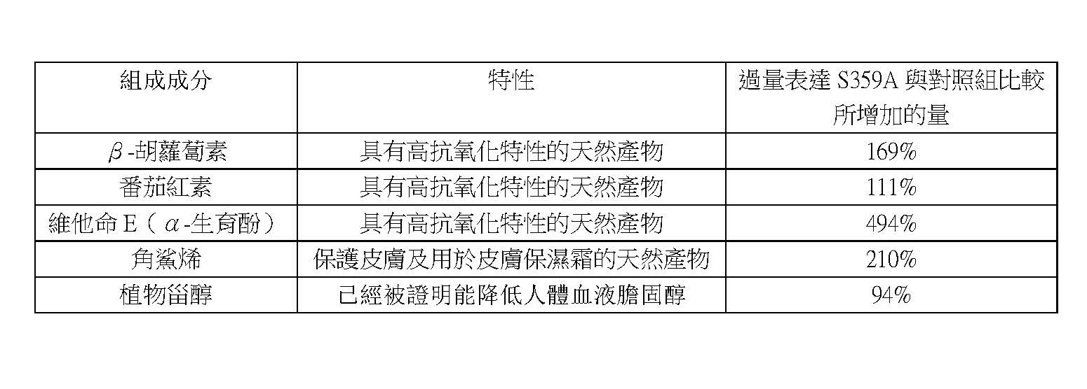 表 1過量表達S359A的番茄果實中β-胡蘿蔔素、番茄紅素、維他命E(α-生育酚)、角鯊烯和植物甾醇含量,與對照組比較顯著增加
