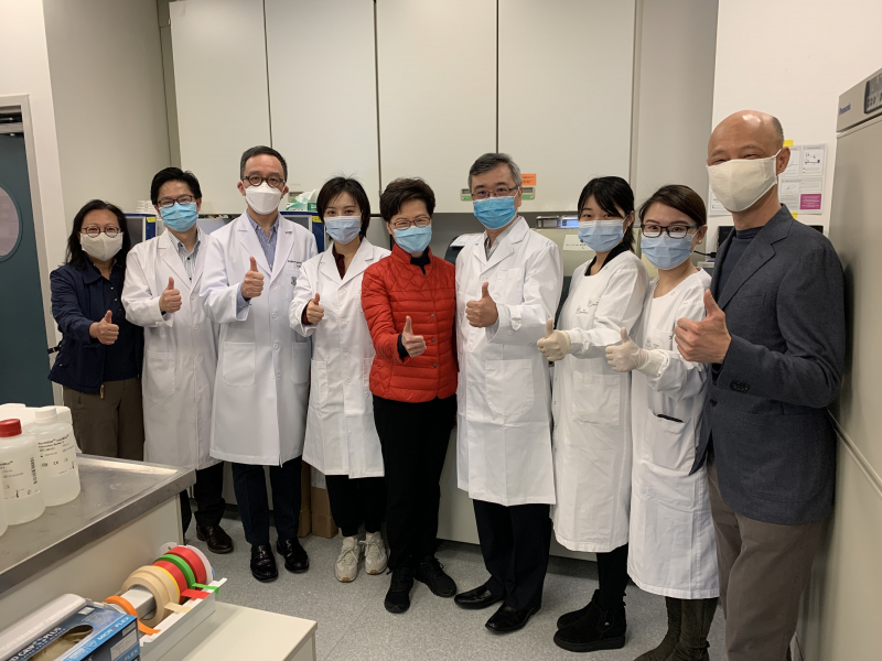 行政長官林鄭月娥於二月十五日到訪香港大學視察新冠病毒污水監測工作,由香港大學李嘉誠醫學院院長梁卓偉教授及張彤教授介紹污水的樣本處理及檢測過程。