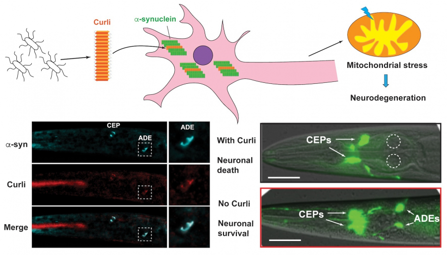 神經退化性疾病由神經元中的蛋白質聚集所引起。過去幾年有不少研究顯示,腸道細菌可能在神經退化性疾病的發病機制中起著重要作用:例如,抗生素治療會殺死大部分的細菌,在小鼠模型中可以緩解柏金遜症的症狀。雖然「微生物群 - 腸 - 腦」連結的概念已被廣泛接受,但科學家對調節神經退化性疾病進程的細菌分子,仍然知之甚少。