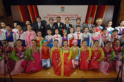 表演完畢後,羅崇文先生(民航處處長)、楊子剛先生、金益晟先生、劉長樂太平紳士、曾德成太平紳士、李永煥先生、周肇平教授(嘉賓職銜請參閱新聞稿內文)與平壤學生少年藝術團全體成員合照 |