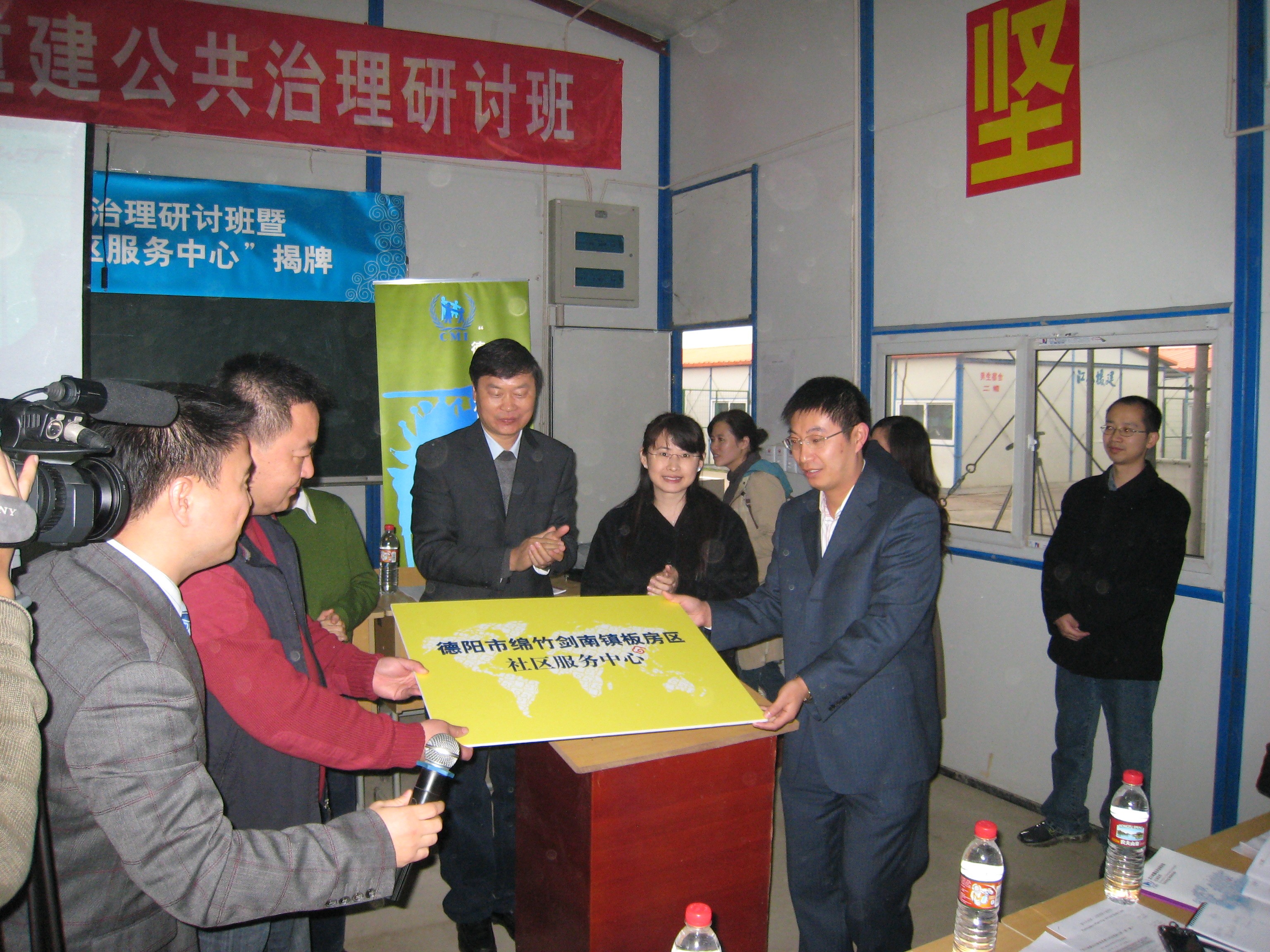 在舉行“汶川地震災區幹部培訓工作坊”前,嘉賓為“德陽市綿竹劍南鎮板房區社區服務中心”主持揭牌儀式。(左起) 劉小楓先生(綿竹市副市長)、陳新有先生(德陽市委副書記、代理市長)、羅淑雯女士(恒生銀行高級企業傳訊經理)、譚焱(劍南鎮政府黨委書記)。 |