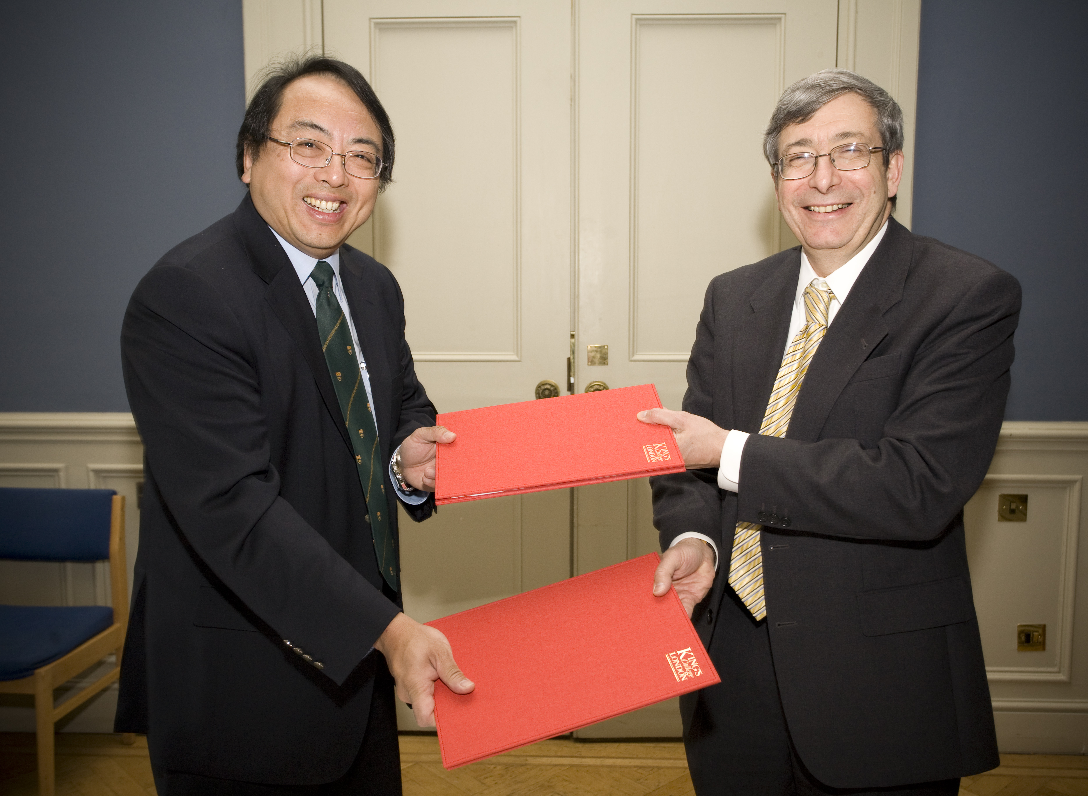 港大校長徐立之及英國倫敦大學國王學院校長Richard H Trainor,簽署博士課程的合作協議,為兩間大學就博士研究課程定下合作框架。博士研究生會在雙方老師的指導下﹐進行研究工作,並要通過符合兩間大學水平的考試。