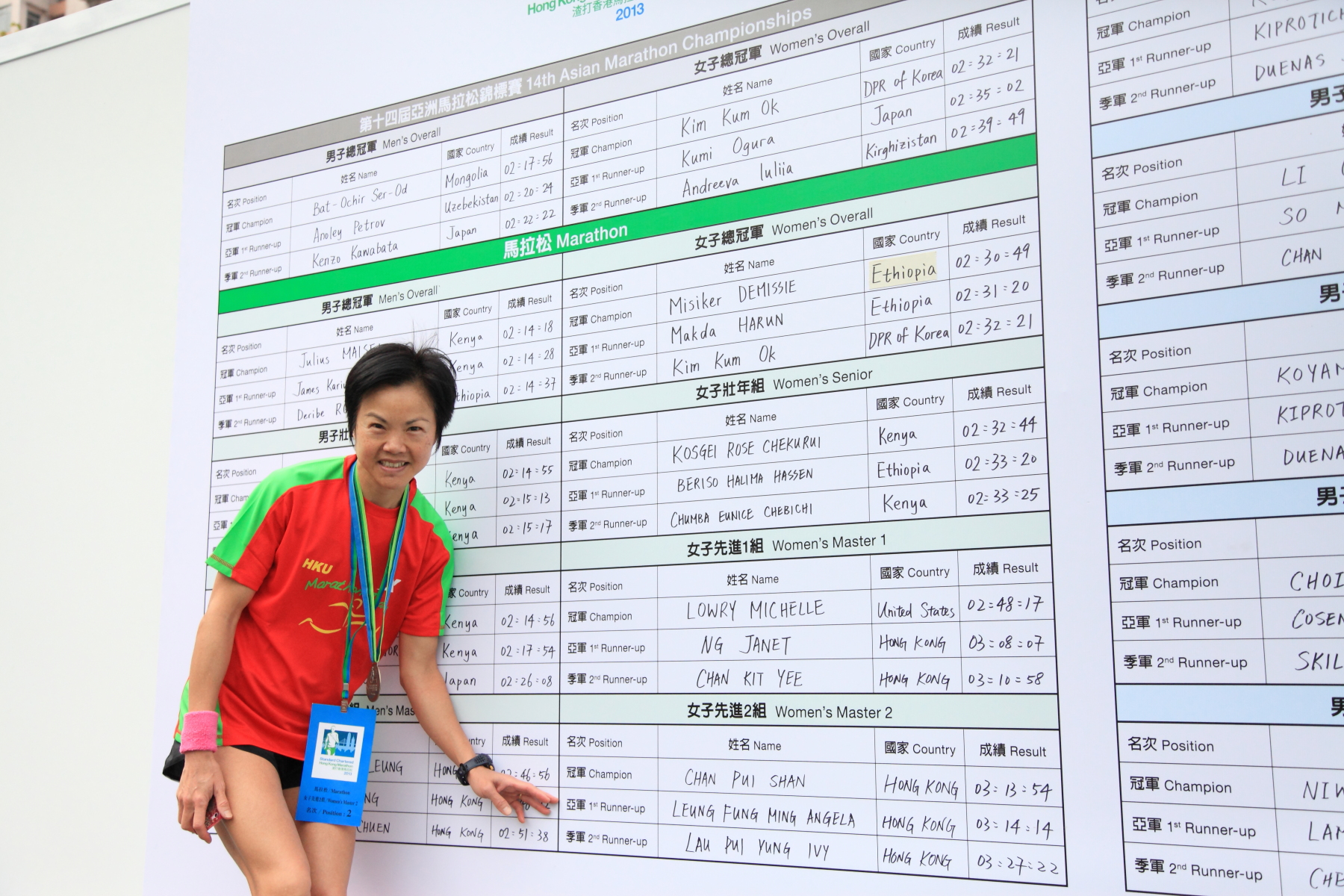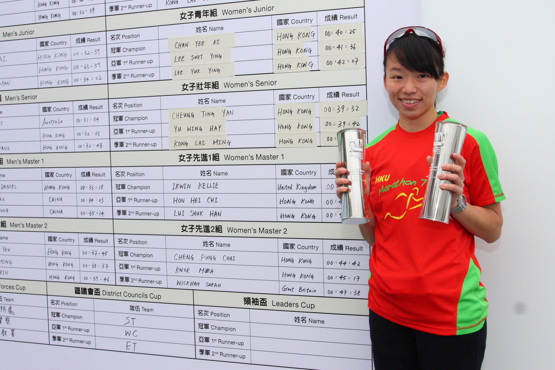 港大校友 Rachel Sproston 在半馬拉松女子先進一組賽事中獲得冠軍,梁鳳鳴醫生獲得全馬拉松女子先進二組亞軍。醫科學生余穎曦分別獲得十公里挑戰賽女子組總亞軍和壯年組亞軍。