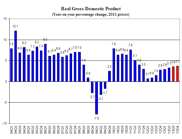 We revised our real GDP growth forecast for the whole year of 2013 to 3.4%. This growth is driven mainly by the mild improvement of the external sector and the robust internal demand. This forecast growth rate is near the lower bound of our forecast we set out at the beginning of the year, and this is mainly due to the weaker-than-expected recovery of the external sector.