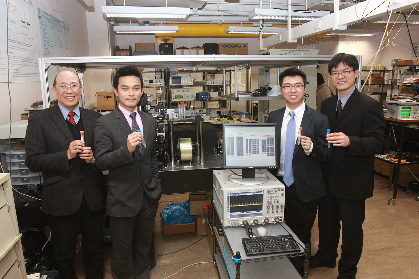 HKU advances new technology ATOM. Members of the research group includes (from left) Dr. Kenneth Wong Kin-yip and Dr. Kevin Tsia Kin-man of the Department of Electrical and Electronic Engineering, Faculty of Engineering, Professor Godfrey Chan Chi-fung of the Department of Pediatrics and Adolescent Medicine, Li Ka Shing Faculty of Medicine, and Dr. Anderson Shum Ho-cheung of the Department of Mechanical Engineering, Faculty of Engineering.