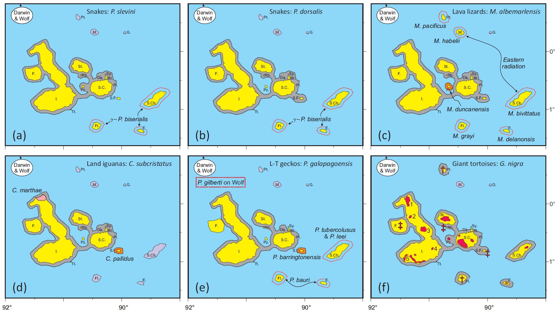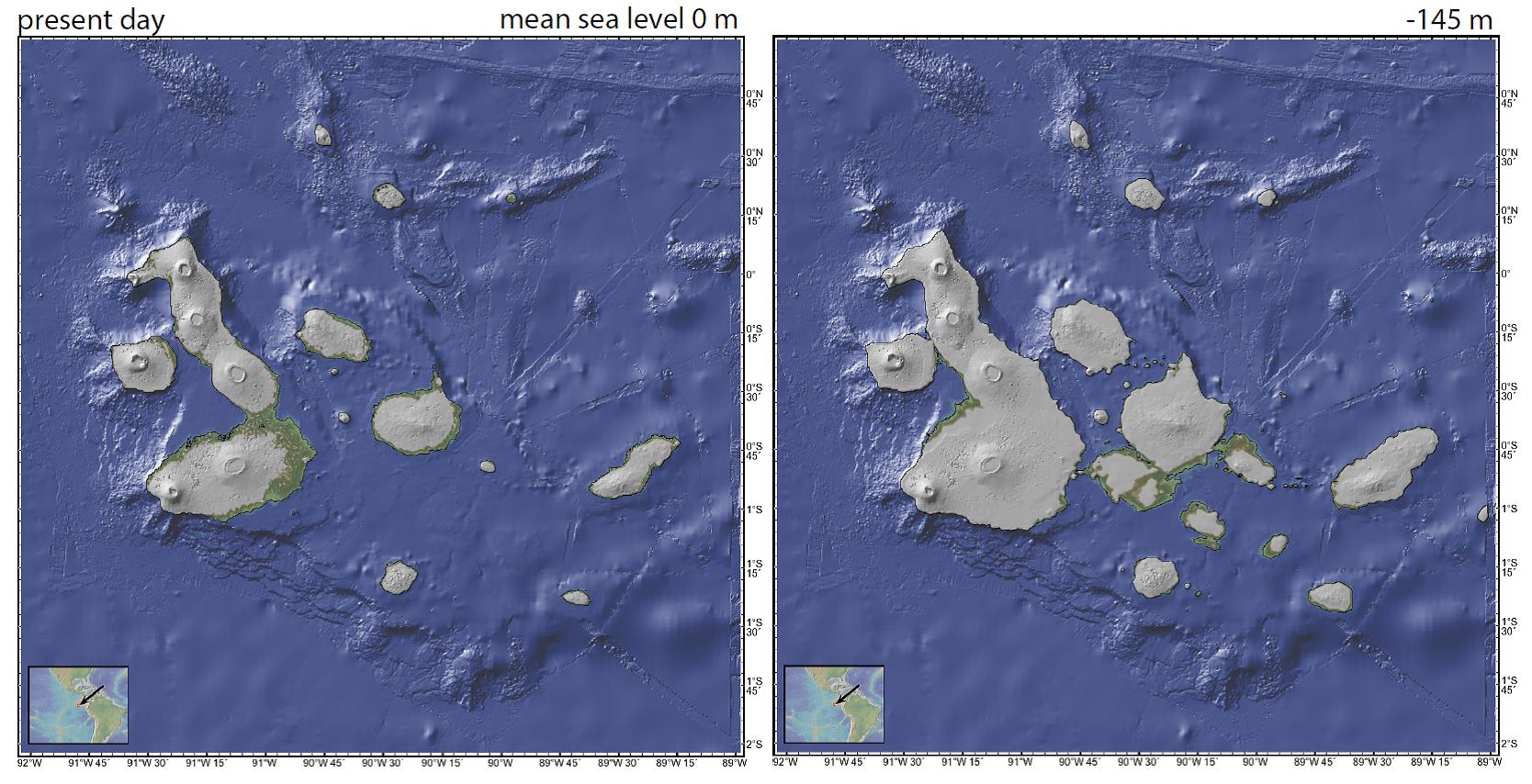 The study, to be published in the Journal of Biogeography, indicates that major shifts in sea level, caused by various climatic and geological processes, regularly reconfigures Galapagos’ geography. The extreme lows drop the shore-lines somewhere between 130 and 210 metres. At these times, the islands in the centre and west of the chain (“core”) coalesce into a mega-platform as illustrated in Figure 1 below. During these 10,000 year connection intervals, the long-isolated reptile forms are free to move around the new landmass. However, the sea-level rises that follow force them back on to higher ground where they are genetically trapped for around 90,000 years.
