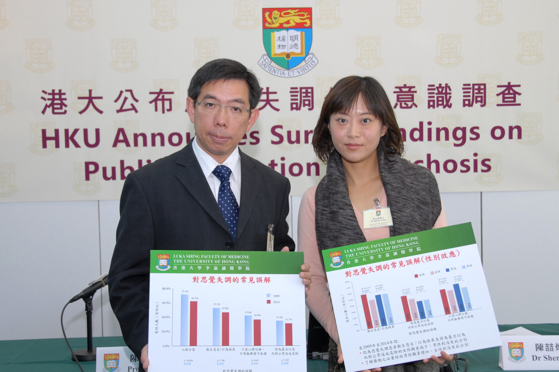 Researchers from Department of Psychiatry, Li Ka Shing Faculty of Medicine, The University of Hong Kong (HKU) carried out the first territory-wide local Public Awareness Survey on Psychosis, funded by the Hong Kong Jockey Club Charities Trust, in 2009 and a follow-up survey in 2014. Results show that despite some improvement on the knowledge and misconceptions about psychosis over the past five years, there is no significant improvement on attitude and discrimination towards individuals with psychosis. Professor Eric YH Chen (Left), Head and Clinical Professor of the Department of Psychiatry, Li Ka Shing Faculty of Medicine, HKU and Dr Sherry KW Chan (Right), Clinical Assistant Professor of the Department of Psychiatry, Li Ka Shing Faculty of Medicine, HKU.
