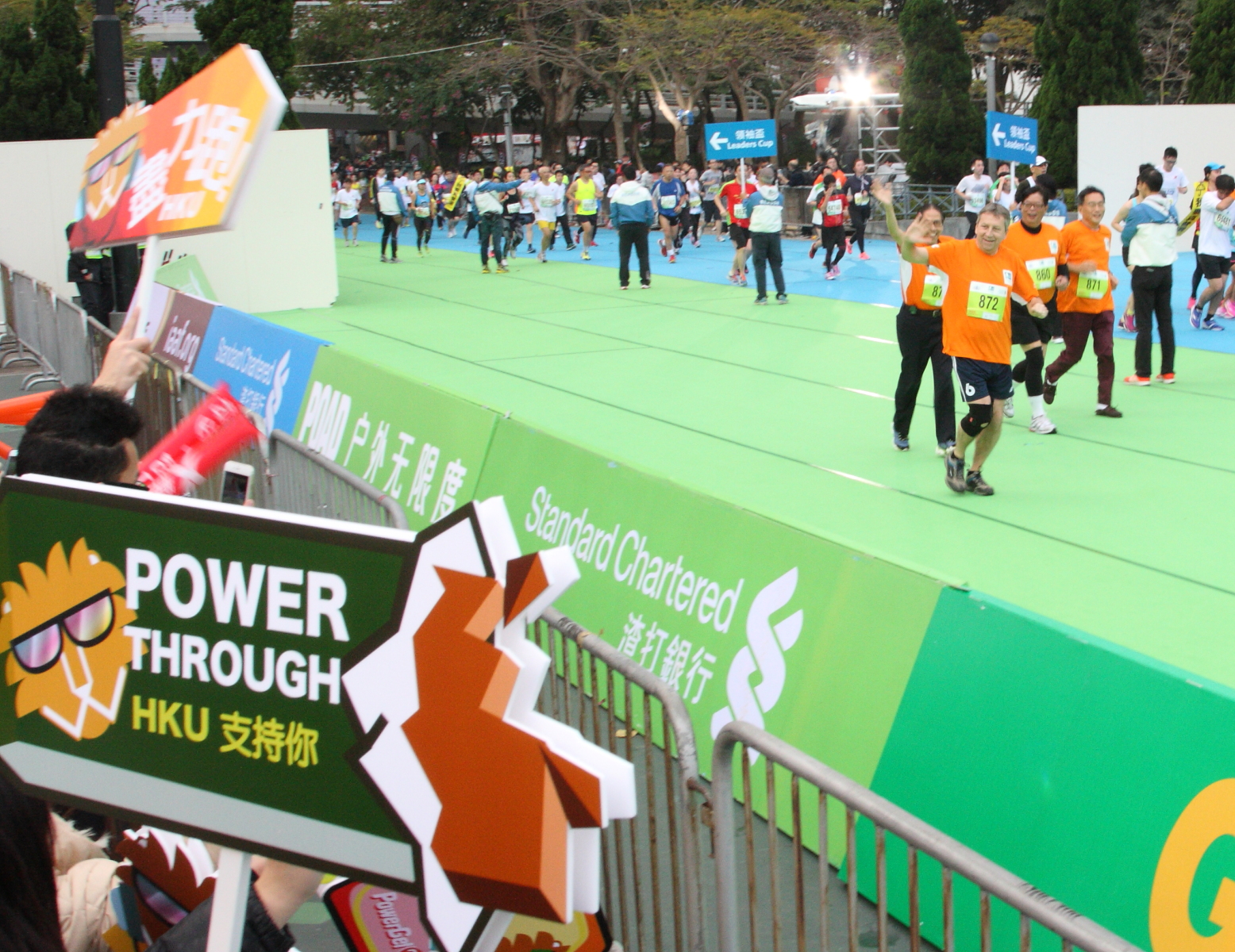 More than 2,200 runners from the University of Hong Kong (HKU) participated in various races of the Standard Chartered Hong Kong Marathon 2015 today (January 25, Sunday). Some 300 students and staff joined the supporting and cheering team to cheer on the runners along the routes. Professor Peter Mathieson, President and Vice-Chancellor of HKU, participated in the Leaders Cup for the first time and cheered on other HKU runners.
