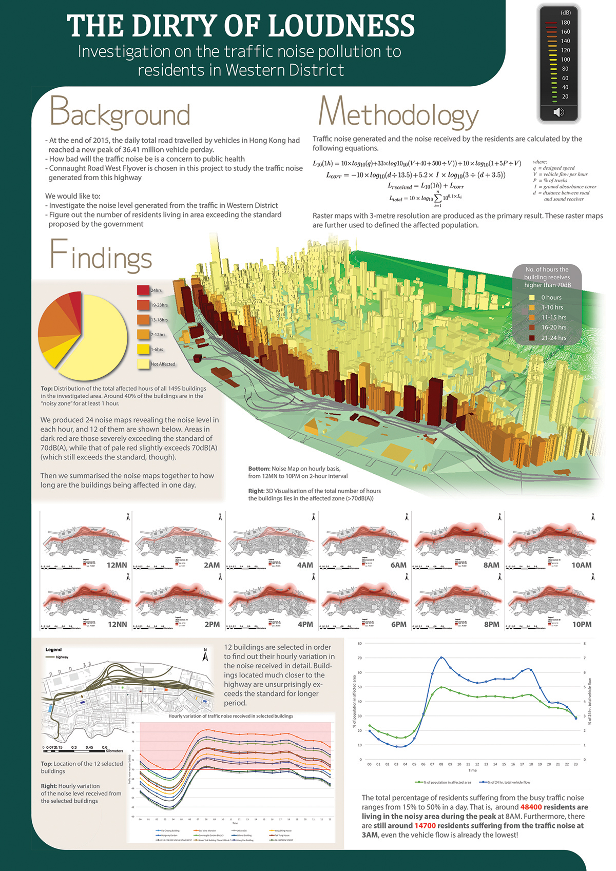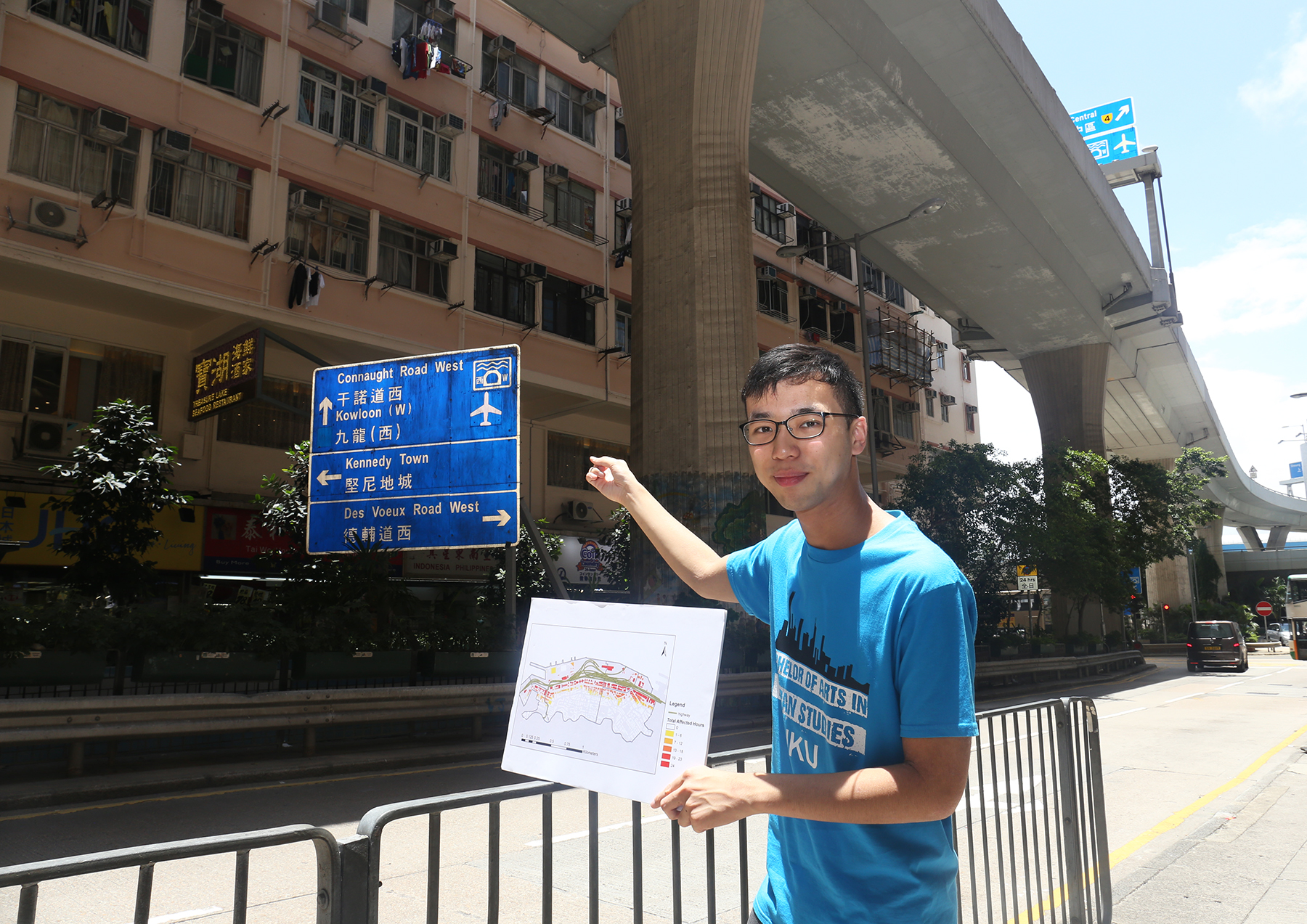 Kenneth’s research aims to identify the impact of traffic noise pollution on the residents of the Western District, and the results reveal that part of the buildings in Western District are exposed to serious traffic noise pollution. One of his research findings showed that traffic noise of about 60 buildings located next to the highway exceeded recommended standards all day.