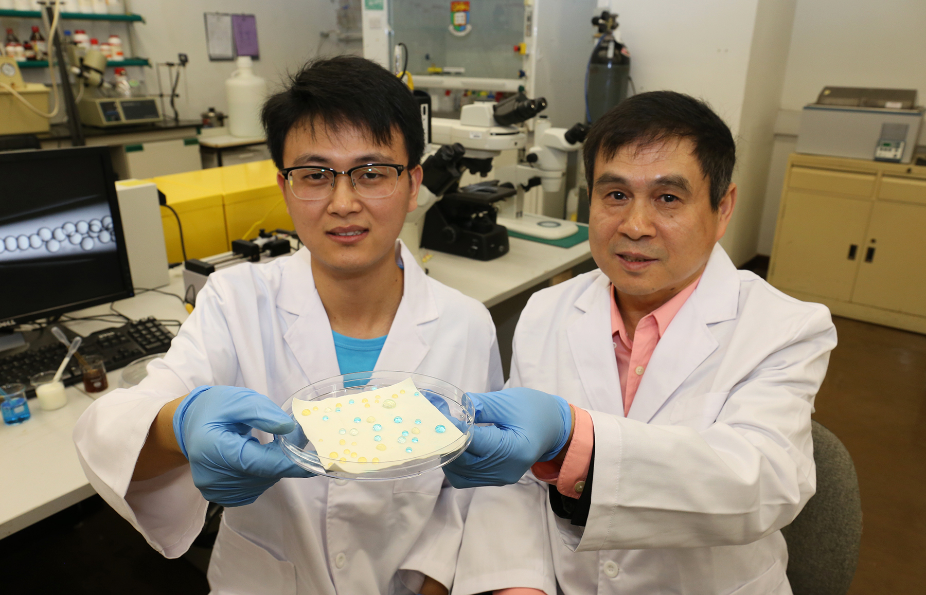 Professor Wang Liqiu (right) and Dr Zhu Pingan from HKU Mechanical Engineering Department showcase the liquid repellent material they innovated.