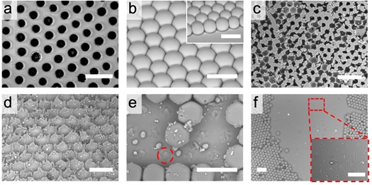 (d) Porous surface after template removal. (e-f) Images of porous surfaces with different pore sizes.