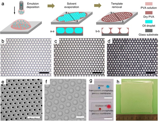 (g) Transparency of porous surfaces. (h) Wafer-scale fabrication of the porous surface.