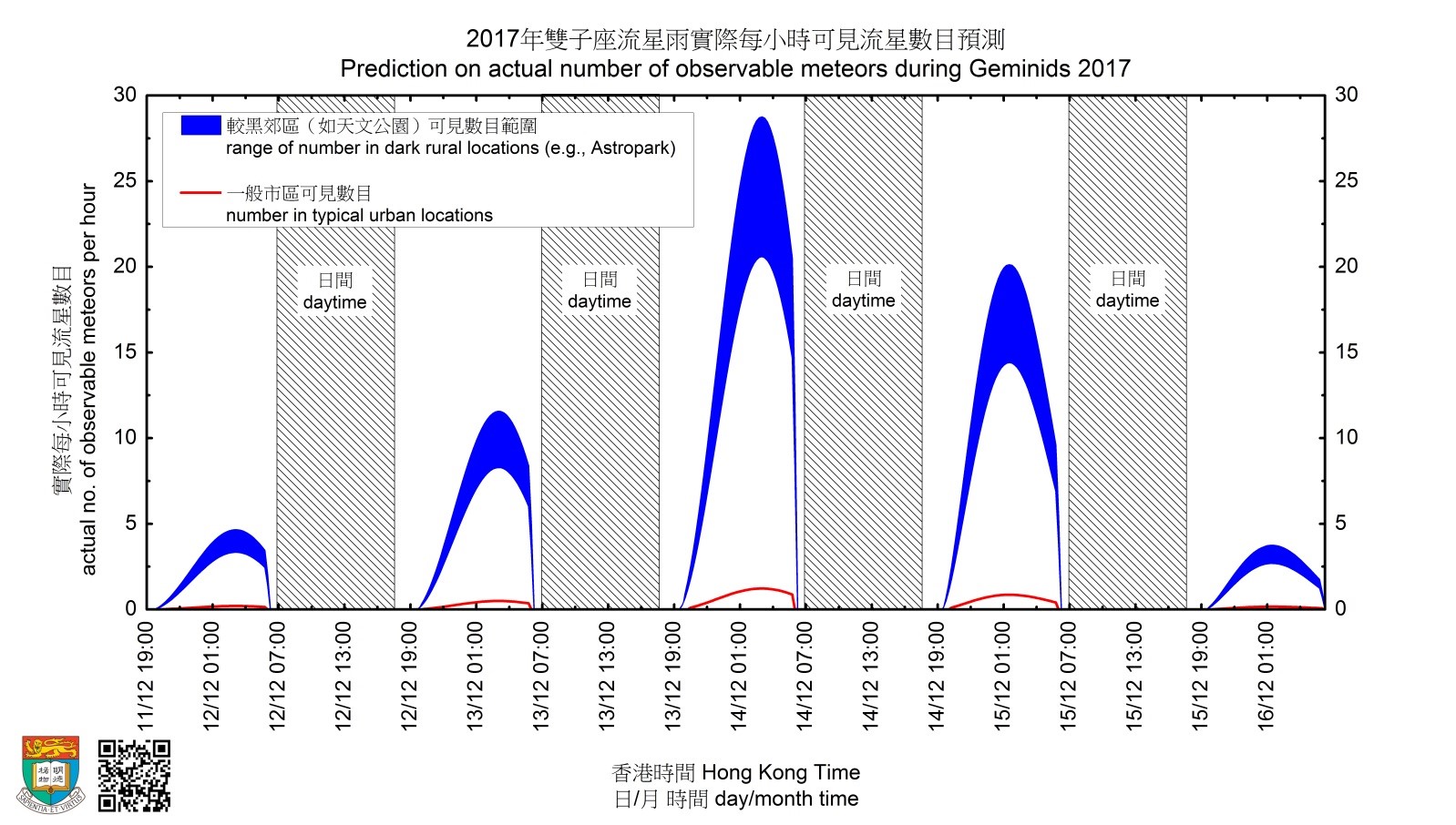HKU astronomer and Project Manager of the Hong Kong Night Sky Brightness Monitoring Network, Dr So Chu-wing computes the number of meteors observable in Hong Kong based on the light pollution data collected from the Monitoring Network and the meteor shower model of NASA scientist Dr Peter Jenniskens. Based on the calculations, if local weather permits, the number of meteors observable from this Geminid Meteor Shower in a dark location with a wide field-of-view, such as the Astropark in Sai Kung, could possibly reach 20-30 per hour during the best observation hours of between midnight and 5 am on December 14, while the number for an urban site can be no more than 1 per hour during the same period! This implies the severe light pollution in Hong Kong leads to a drop of over 50% of the actual number of meteors observable in most places, and over 90% in urban locations.