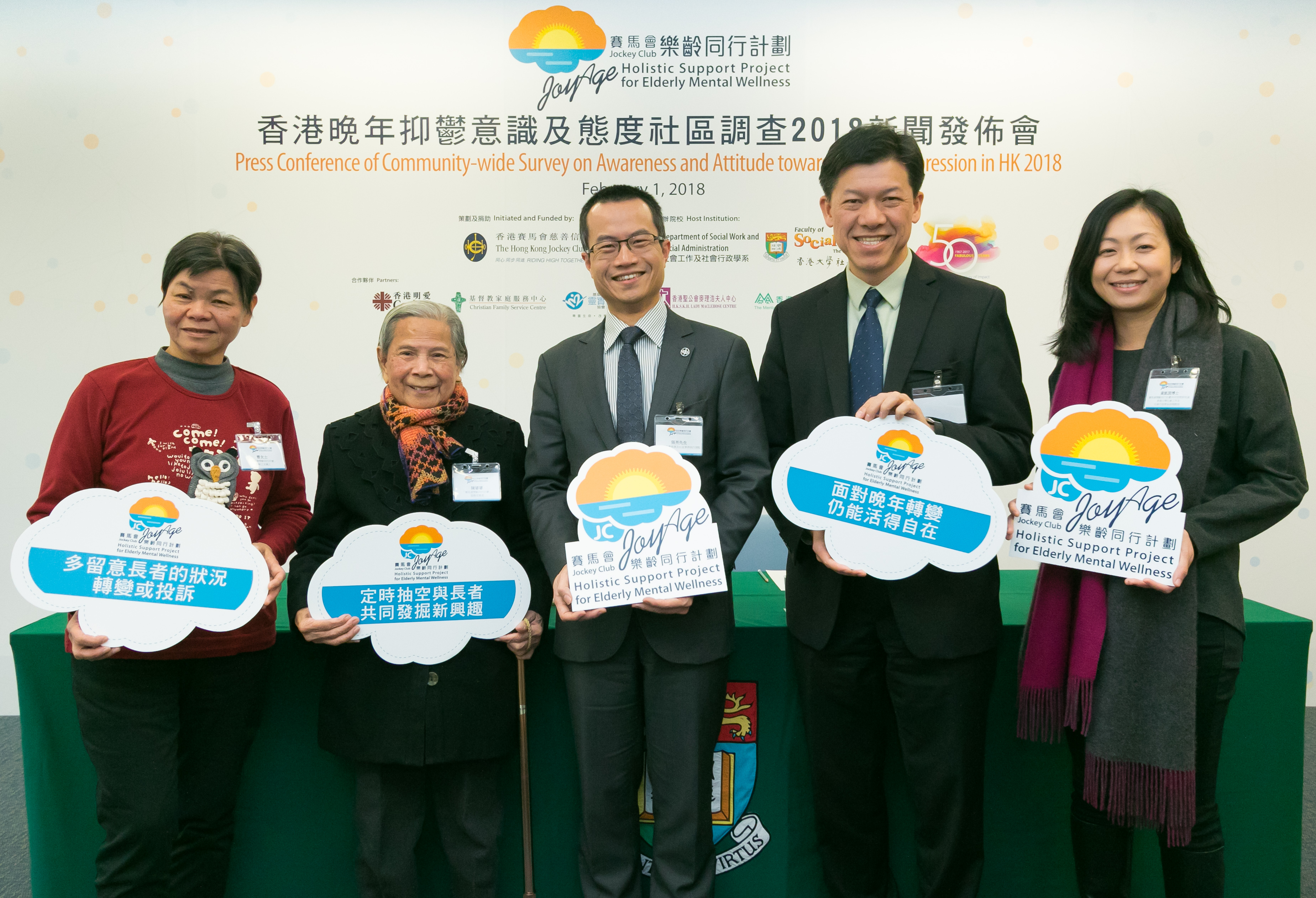 “JC JoyAge: Jockey Club Holistic Support Project for Elderly Mental Wellness” (JC JoyAge)” Press Conference on Community-wide Survey on Awareness and Attitude towards Elderly Depression in HK 2018: (From Right) Dr. Gloria Wong, Assistant Professor, Department of Social Work and Social Administration, Faculty of Social Sciences, HKU & Co-Principal Investigator of JC JoyAge; Professor Terry Lum, Professor, Department of Social Work and Social Administration, Faculty of Social Sciences, HKU & Project Director of JC JoyAge; Mr. Leong Cheung, Executive Director, Charities and Community, The Hong Kong Jockey Club; Ms. Chan, service recipient from JC JoyAge and Ms. Tso “Peer Supporter” of JC JoyAge.
