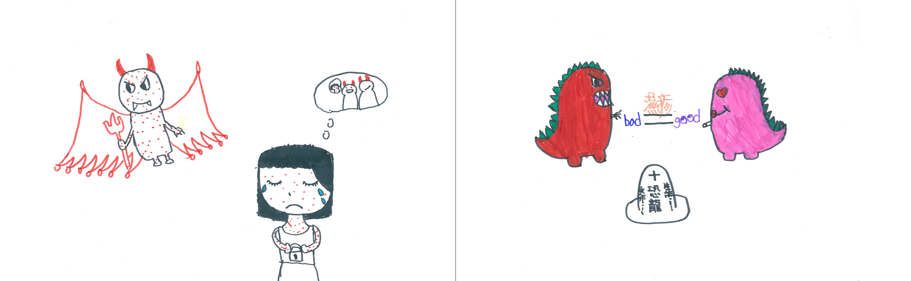 Positive changes revealed in children’s drawing. Drawing 1 shows the topic “My Eczema” before the intervention program. The child describes eczema as “the descending devil who takes away the key to my social life. When people laugh at my eczema, it is indeed the devil laughing at me as well. I am very unhappy about the devil.” Drawing 2 shows the same topic drawn after the 6-week intervention. The same child seemed to have changed her interpretation of eczema, describing it as “something that itches and bleeds sometimes (like the red dinosaur), but at other times it can be gentle and happy (like the pink dinosaur)”.