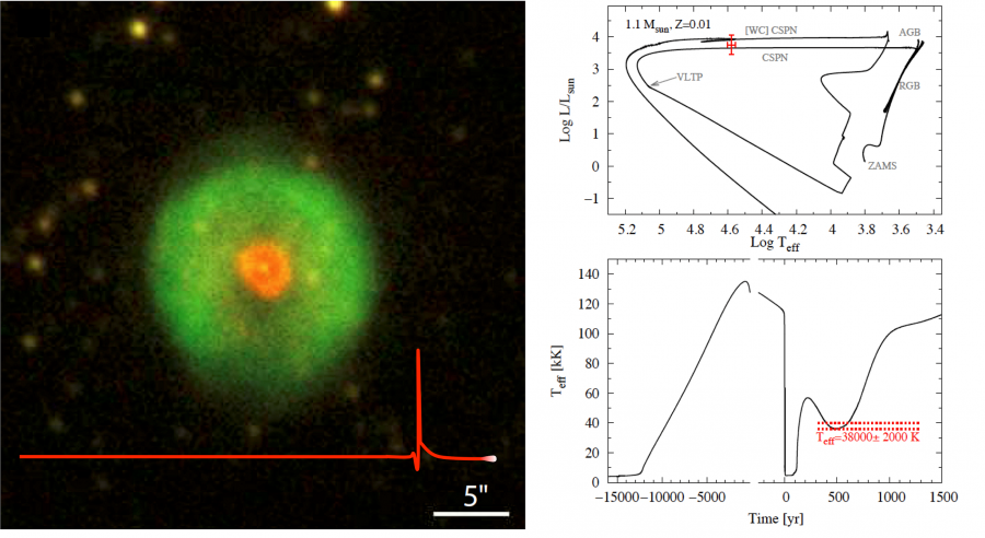 Left: Color-composite picture of planetary nebula (PN) HuBi 1 obtained at the 2.5-metre Nordic Optical Telescope; red color is the [N II] l6583 line emission and green is Ha l6563. Right: Evolutionary sequence of a PN progenitor (with an initial mass of 1.1 solar masses) that experiences a very late thermal pulse (VLTP). Top-right panel shows the evolutionary track in the Hertzsprung-Russell (H-R) diagram; the red symbol marks the current location of HuBi 1’s central star. Bottom-right panel shows the post-asymptotic giant branch (post-AGB) time evolution of the central star temperature (Teff); the origin of time is set at the moment of the VLTP event; the red-dotted lines mark the uncertainty in Teff. Images were adopted from Guerrero, Fang, Miller Bertolami, et al. (2018, Nature Astronomy, tmp, 112).