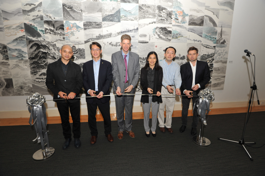 (From left) Ribbon-cutting ceremony by Deputy Curator of the Zhejiang Art Museum Professor Ying Jinfei, Vice-President and Pro-Vice-Chancellor (Global) of HKU Professor W. John Kao, UMAG Director Dr Florian Knothe, Deputy University Librarian and Fung Ping Shan Librarian Ms Woo Mei Wa, HKU Associate Professor of School of Humanities (Music) Dr Yang Yuanzheng and UMAG Curator and Publisher Mr Christopher Mattison.