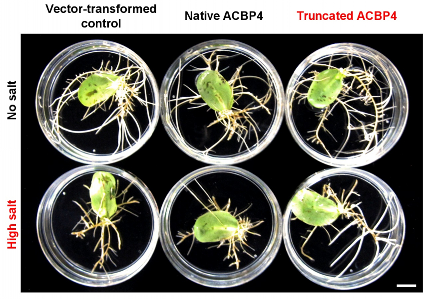 Figure 1. Overexpression of truncated ACBP4 variant promotes salt tolerance in soybean hairy roots. Soybean hairy roots overexpressing the native (bottom middle) and truncated (bottom right) forms of ACBP4 were more salt-sensitive and salt-tolerant than the vector-transformed control (bottom left), respectively. Under normal conditions, the hairy roots of all genotypes grew similarly (top panels). Scale bar = 1 cm.
