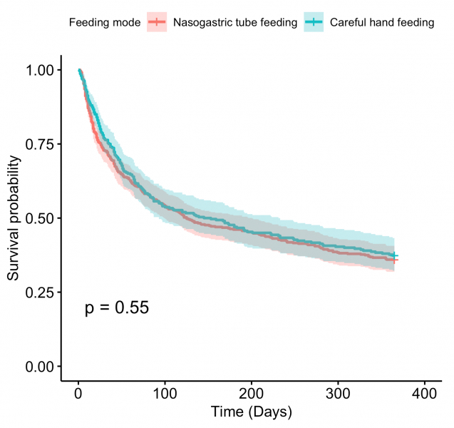 There was no significant difference in one-year survival between the nasogastric tube feeding and careful hand feeding groups, with a median survival of 125 and 145 days respectively.