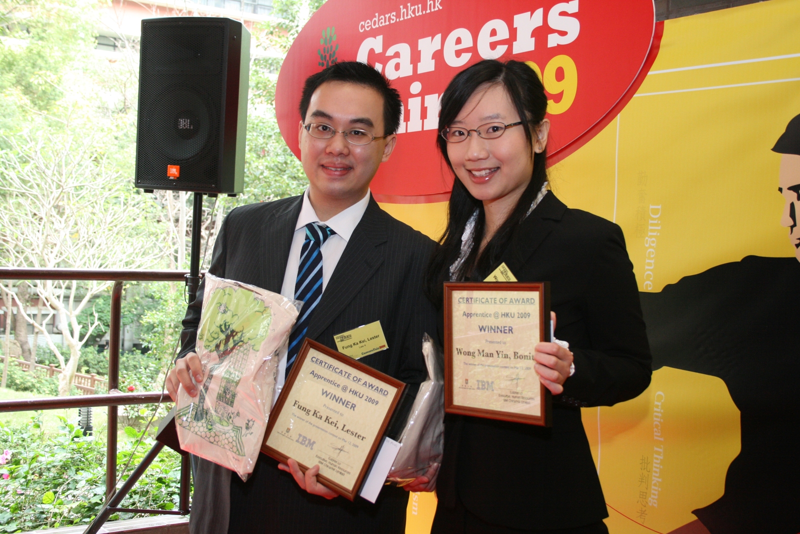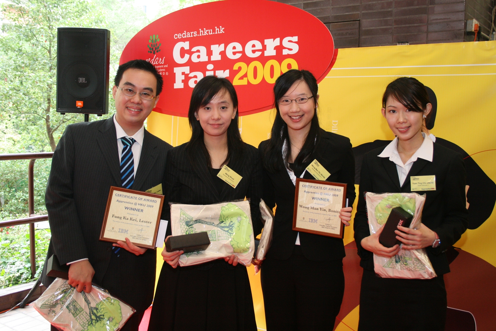 For the four-day fair, the Centre organized different lunch-time activities and seminars with specific topics. On March 10, a drama "Everyone Can Be a Kung Fu Master" was performed by Chinese Martial Arts Association and Chinese Martial Arts Alumni Association with the aim of delivering a key message that job hunting and career planning need to start with the basics and personal qualities. Apart from inviting SMEs to hire on campus, we invited voluntary organizations to recruit students as volunteers. We promoted the spirit of proactive volunteerism and encouraged students to acquire learning-through-serving. A group of volunteers shared their Sichuan service experience through music on March 11. One of the most popular events, "Apprentice@HKU", has been organized for four consecutive years. For the past three weeks, 32 short-listed students attended group discussions, of which 4 candidates were selected for the final stage of competition. The finalists met again on stage to give a short presentation on "A Smarter Planet", which was a designated project of IBM Global Technology Services. Additionally, they were also challenged with questions from the judging panel and other contestants. The panel of judges for the competition consisted of IBM Global Technology Services representatives - Albert Wong, Manager of Service Management, Seron Lo, Service Delivery Manager, and Herman Chan, Director of Careers and Placement, HKU. At the end Lester Fung Ka Kei (Year 4 student of Bachelor of Laws) and Bonita Wong Man Yin (Year 3 student of Bachelor of Business Administration [Law]) were selected to be the winners who will be awarded 2-month IBM internship contracts. For programme details, you can visit: http://cedars.hku.hk/careersfair/09/ For media enquiries, please contact Ms Joanne Yung, Manager (Media) (Tel: 2859 2600/Email: hkumedia@hku.hk) |