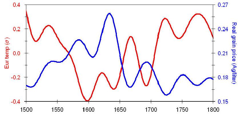 Fig. 1. Multi-decadal variability of temperature and the real grain price in Europe. In European history, lower temperature is associated with higher real grain price, vice versa.