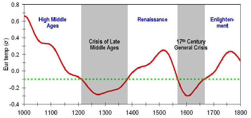 Prof. David D. Zhang and colleagues collected and tabulated all available historical data about climate, agro-ecology, economy, society, human ecology, and demography in pre-industrial Europe. Using various statistical methods, they established a set of causal linkages from climate change to human crisis. For example, a cold climate phase from 1560 to 1660 shortened plant-growing seasons and shrunk cultivated land area, which caused grain price increase by 300%. The downward spiral then continued, with famine becoming more frequent and human body height actually declining by 0.8 inches in the late 16th century. According to the authors, human height rose slowly with rising temperatures only after 1650. Agricultural and food supply changes happened soon after cooling periods, but five to 30 years after such climate events, social disturbance, wars, migrations, epidemics and other problems tended to erupt. All of the causal linkages between climate and ecological, social, economic and demographic crises in Europe have been verified in their study, which is also the first scientific verification about climate-crisis causal linkages.