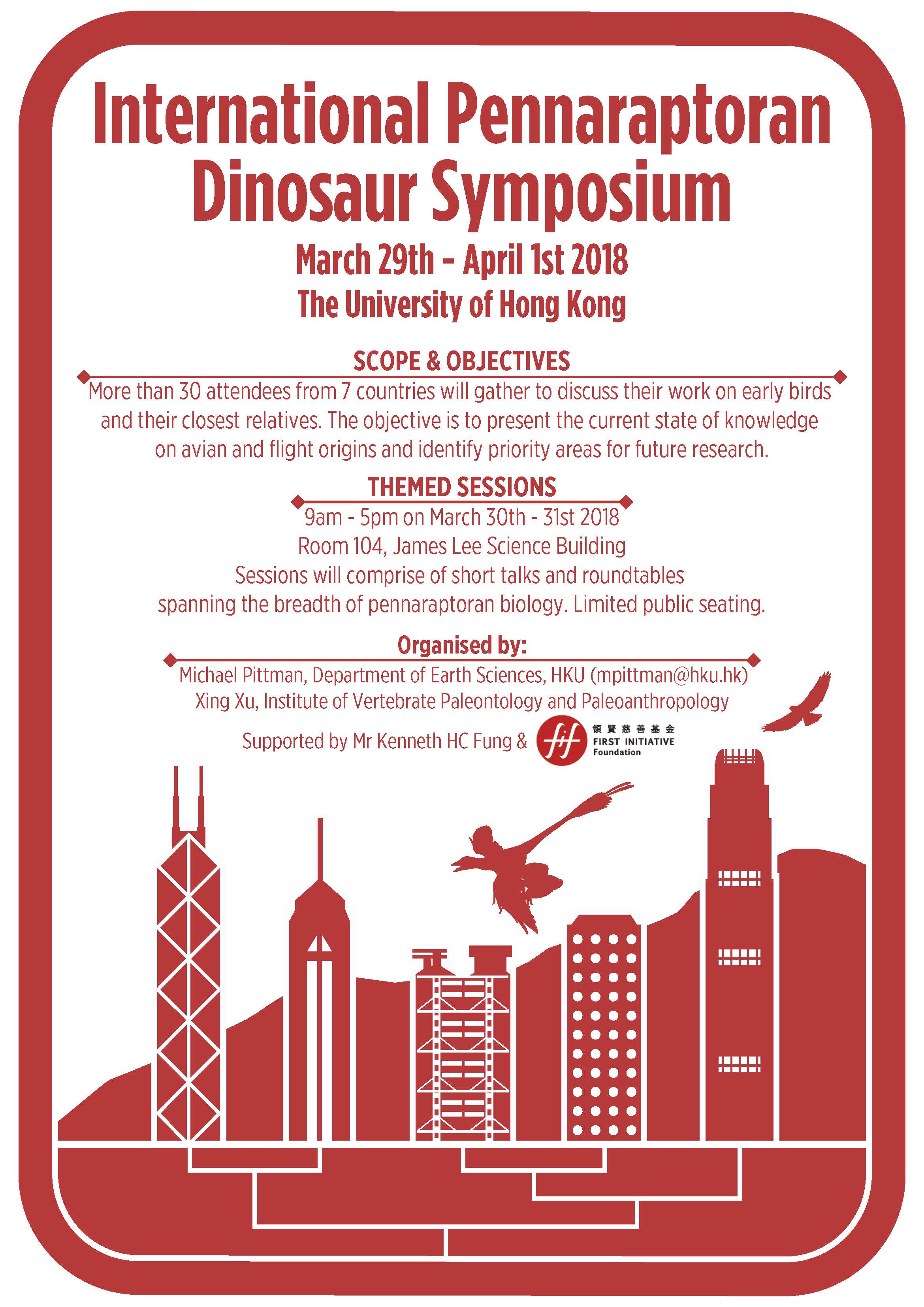 Poster of the International Pennaraptoran Dinosaur Symposium. This symposium about avian and flight origins is being held at the University of Hong Kong from March 29th to April 1st 2018 and involves 30 attendees from 7 countries. Credit: Ray Lau / M Pittman.
