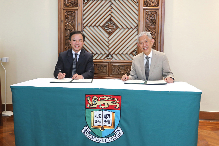 Mr Tin Hing Sin, Chairman of the Tin Ka Ping Foundation (right), signs the donation agreement with HKU President and Vice-Chancellor Professor Xiang Zhang (left).