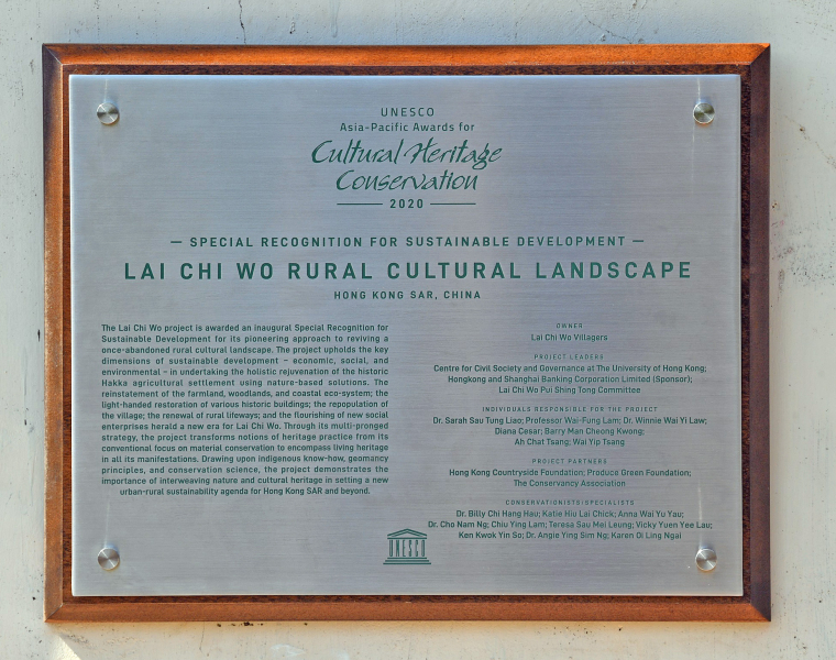 The “Special Recognition for Sustainable Development” was newly introduced to the UNESCO Asia-Pacific Awards for Cultural Heritage Conservation in 2020 together with an updated set of Awards Criteria to acknowledge more prominently the role and contribution of cultural heritage to sustainable development within the broader framework of Agenda 2030. The Lai Chi Wo Rural Cultural Landscape project was selected as one of the two winners of this Special Recognition from among 48 entries from nine countries in the Asia-Pacific region. The Jury applauded the Lai Chi Wo project’s pioneering approach to rural sustainability which “upholds the key dimensions of sustainable development – economic, social and environmental – in undertaking the holistic rejuvenation of the historic Hakka agricultural settlement using nature-based solutions.” Details of the project can be found at https://ccsg.hku.hk/ruralsd/