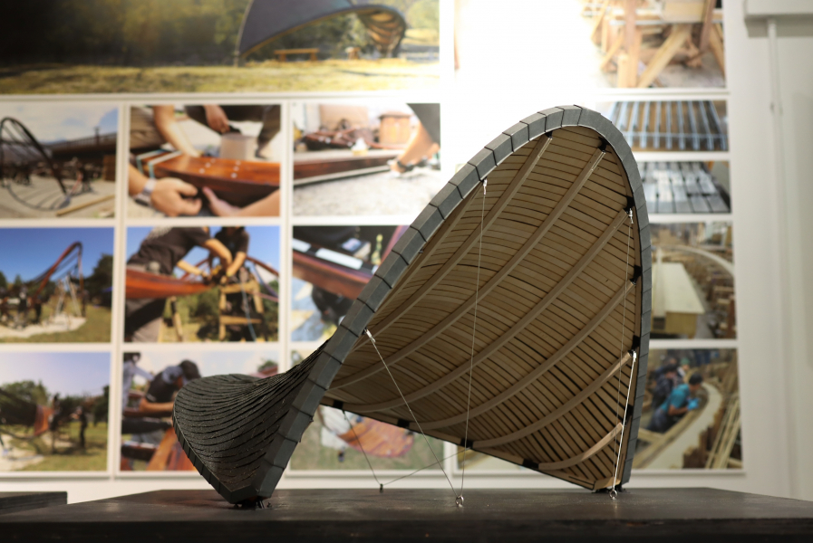 「弦閣:低技術木建築施工的先進數碼設計法」展覽由即日起至2月16日(星期五)於香港中環元創方舉行,展品包括建築圖紙、原型模型和記錄片等弦閣的製作和施工過程。展覽亦陳列出一系列前導研究和歷史先例,揭示懸鏈線膠合層壓木樑(glulam)作為屋頂結構系統在建築上的複雜性和潛力。