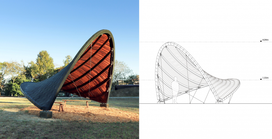 BSL研究團隊在展亭的簡化非標準輕型懸鏈木結構設計上,應用了創新的數碼化設計和演算法,實現在簡單傳統的低技術環境下,利用進化演算達至最佳結構效果和成本效益,將施工的複雜程度減至最低,並藉此提倡木材作為一種可持續的低碳建築材料。