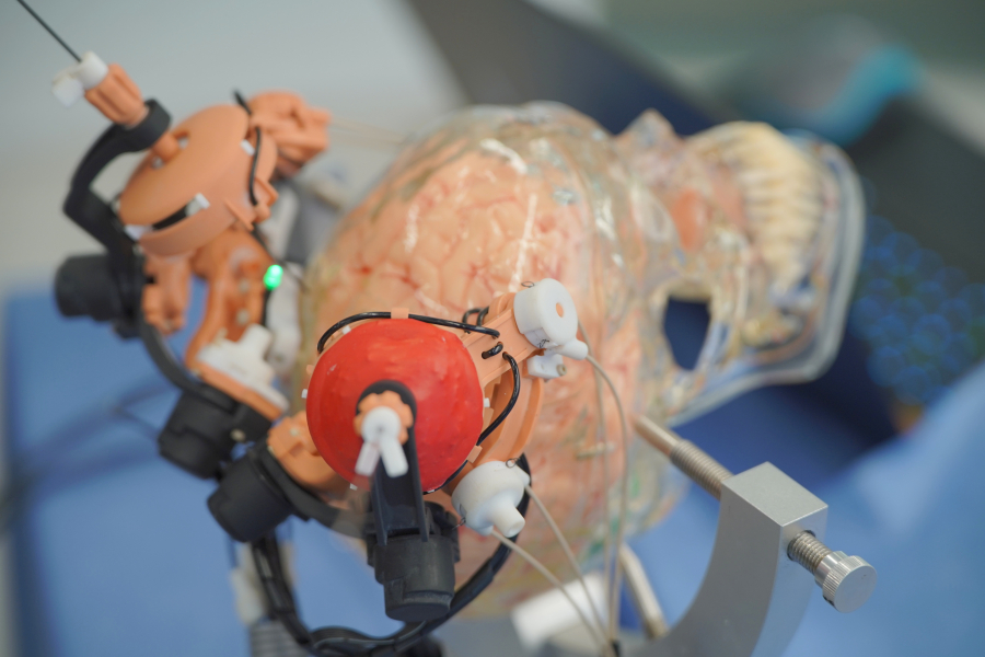 然後,外科醫生通過機械人儀器導向器手動插入儀器。而其深度鎖止器可輔助設定器械探入的深度。新研發的系統可以消除傳統基於框架的立體定位手術中的固有誤差。因此,探針/電極儀器插入精確度將增加,確保手術結果的安全性。系統將縮短手術時間,提高患者的舒適感和滿意度。